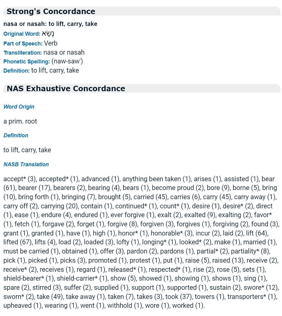 3: The Hebrew word often translated "take" in the command not to take the Lord’s name in vain also means "lift" or "carry". It's translated "bear" 61 times, "lift" 64 times, “lifted” 67 times, and "take" 49 times in the NASB translation.